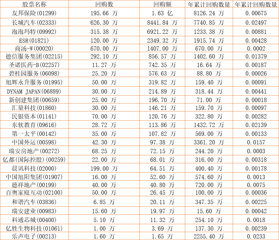 晨讯科技(02000)、第一太平(00142)、百奥家庭互动(02100)、旭辉永升服务(01995)、DYNAM JAPAN(06889)、中国旭阳集团(01907)、泡泡玛特(09992)、亿胜生物科技(01061)、中国外运(00598)、瑞安房地产(00272)、长城汽车(02333)、民银资本(01141)、亿都(国际控股)(00259)、友邦保险(01299)、德祥地产(00199)、新创建集团(00659)、商汤-W(00020)、汇量科技(01860)、碧桂园服务(06098)、东软教育(09616)、瑞安建业(00983)、乐声电子(00213)、德信服务集团(02215)、圣诺医药-B(02257)、和谐汽车(03836)、ESR(01821)、科通芯城(00400)于2022年7月19日进行了回购。其中,回购金额最大的为友邦保险(01299),回购数量195.66 万,回购金额1.63 亿元。