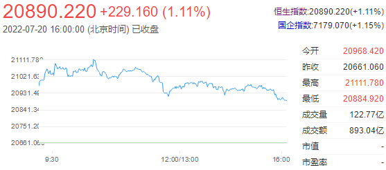 今日开盘,港股恒指高开1.49%,随后涨幅扩大。午后恒指走弱,截至收盘,恒生指数(20890.221 229.16 1.11%)涨1.11%,报20890.22点;国企指数涨1.15%。恒生科技指数(4576.86 70.12 1.56%)涨1.56%,商汤大涨逾10%,哔哩哔哩涨6%,华虹半导体(26 1.00 4.00%)、携程集团涨4%,网易涨近4%,美团涨近3%。港股后市方面:港股上午收升359点。午后虽仍呈升势,但明显地收窄升幅。由于连日的资金撤走,以致银行体系内结余跌穿2,000亿元至1,851亿元。也造就港股成交大幅减少,昨日更少过千亿元,低至841亿元,创自5月4日后最小金额。相信是日成交金额亦是不足千亿元。