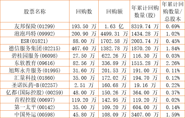 晨讯科技(02000)、亿胜生物科技(01061)、百奥家庭互动(02100)、DYNAM JAPAN(06889)、旭辉永升服务(01995)、首程控股(00697)、民银资本(01141)、艾德韦宣集团(09919)、亿都(国际控股)(00259)、泡泡玛特(09992)、第一太平(00142)、瑞安建业(00983)、友邦保险(01299)、德信服务集团(02215)、汇量科技(01860)、碧桂园服务(06098)、圣诺医药-B(02257)、ESR(01821)、东软教育(09616)于2022年7月20日进行了回购。其中,回购金额最大的为友邦保险(01299),回购数量193.50 万,回购金额1.63 亿元。