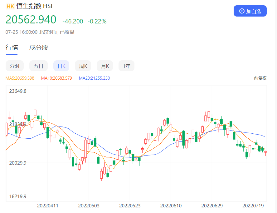 北京时间7月25日16:00,恒生指数收盘下跌46.2点,跌幅为0.22%,报收20562.94点;国企指数收盘下跌29.61点,跌幅为0.42%,报收7077.09点;红筹指数收盘上涨15.63点,涨幅为0.42%,报收3708.82点。南向资金当日净流入0.17亿港元。