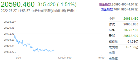 今日早盘,港股恒指低开低走,截至午盘,恒指跌1.51%,报20590.46点。碧桂园(3.21 -0.51 -13.71%)服务暴跌19%,碧桂园跌近14%,领跌蓝筹。