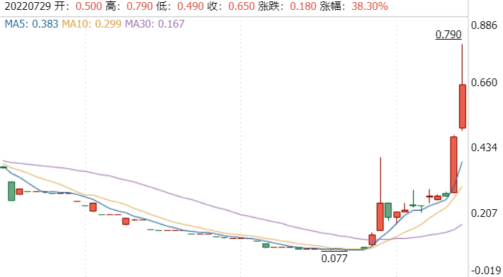 今日走势分析:继昨日收涨77%后,十方控股(01831)继续拉升,早盘股价逆市涨约45%,一度触及0.79港元。自7月14日拉涨以来,近两周累计最高涨8.3倍。截至发稿,十方控股涨44.68%,报0.68港元,成交额0.10亿港元。