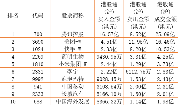 港股通(沪)买卖前十股(单位:港元):
