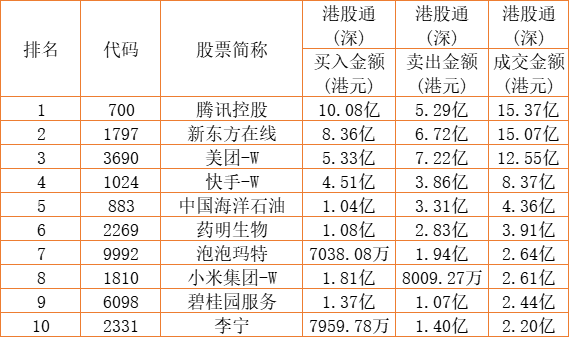 港股通(深)买卖前十股(单位:港元):