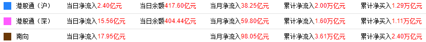 资金动向:南向资金今日合计净流入17.95亿港元