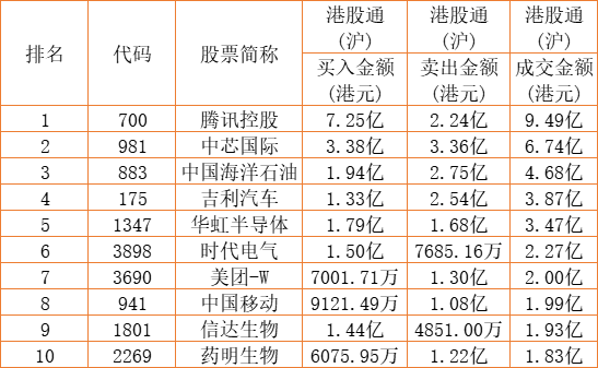 港股通(沪)买卖前十股(单位:港元):