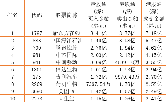 港股通(深)买卖前十股(单位:港元):