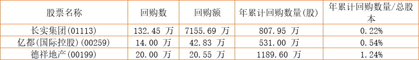 德祥地产(00199)、长实集团(01113)、亿都(国际控股)(00259)于2022年8月8日进行了回购。其中,回购金额最大的为长实集团(01113),回购数量132.45 万,回购金额7155.69 万元。