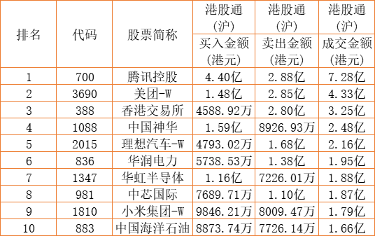 港股通(沪)买卖前十股(单位:港元):