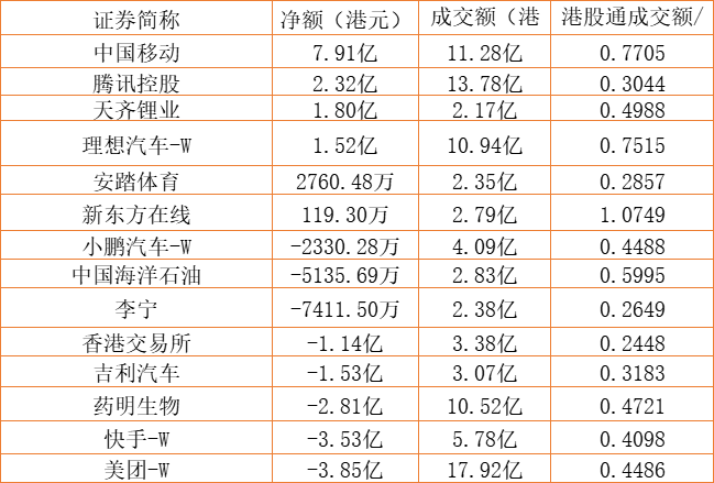 亚汇网8月10日港股通数据统计显示:中国移动(600941)净买入额居首,达7.91亿港元,美团-W净卖出额居第一位。(亚汇网编辑:陌尘)