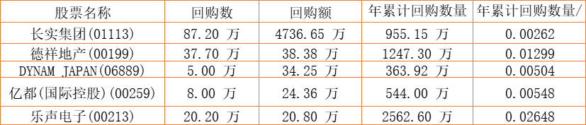 德祥地产(00199)、DYNAM JAPAN(06889)、亿都(国际控股)(00259)、长实集团(01113)、乐声电子(00213)于2022年8月10日进行了回购。其中,回购金额最大的为长实集团(01113),回购数量87.20 万,回购金额4736.65 万元。