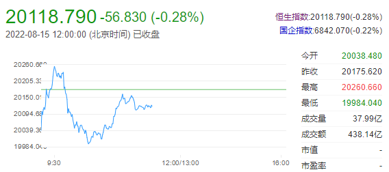 截至午间收盘,恒生指数(20118.791 -56.83 -0.28%)低开0.68%,盘中一度翻红。截至午间收盘,恒生指数跌0.28%,报20118.79点;国企指数跌0.22%,红筹指数跌0.23%。