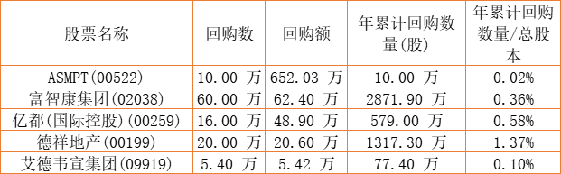 富智康集团(02038)、ASMPT(00522)、德祥地产(00199)、艾德韦宣集团(09919)、亿都(国际控股)(00259)于2022年8月15日进行了回购。其中,回购金额最大的为ASMPT(00522),回购数量10.00 万,回购金额652.03 万元。