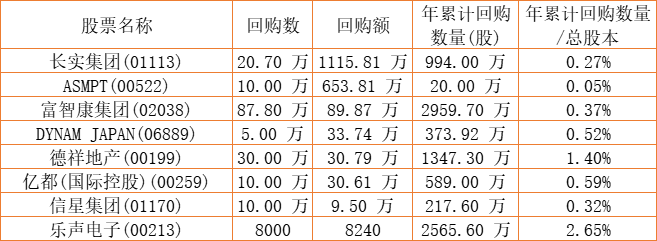 富智康集团(02038)、德祥地产(00199)、ASMPT(00522)、亿都(国际控股)(00259)、信星集团(01170)、DYNAM JAPAN(06889)、长实集团(01113)、乐声电子(00213)于2022年8月16日进行了回购。其中,回购金额最大的为长实集团(01113),回购数量20.70 万,回购金额1115.81 万元。
