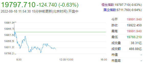 截至午间收盘,恒生指数(19800.24 -122.21 -0.61%)跌0.63%,报19797.71点;国企指数跌0.64%,红筹指数跌0.19%。恒生科技指数(4201.12 -37.78 -0.89%)跌0.87%,哔哩哔哩跌4.83%,百度跌3.39%,京东跌2.24%。