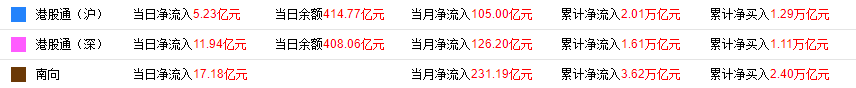 截至8月18日港股收盘,南向资金全日合计净流入17.18亿港元。其中,沪市港股通净流入5.23亿港元,深市港股通净流入11.94亿港元。