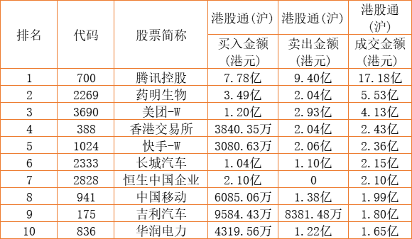 港股通(沪)买卖前十股(单位:港元):