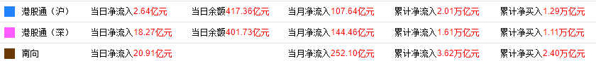 截至8月19日港股收盘,南向资金全日合计净流入20.91亿港元。其中,沪市港股通净流入2.64亿港元,深市港股通净流入18.27亿港元。