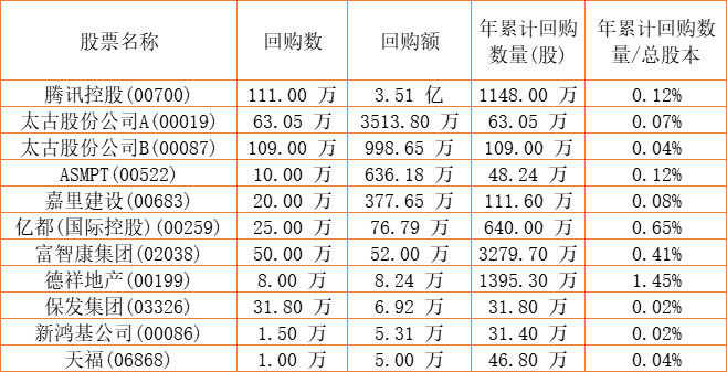 ASMPT(00522)、德祥地产(00199)、DYNAM JAPAN(06889)、亿都(国际控股)(00259)、嘉里建设(00683)、新鸿基公司(00086)、天福(06868)、保发集团(03326)、腾讯控股(00700)、太古股份公司A(00019)、太古股份公司B(00087)于2022年8月19日进行了回购。其中,回购金额最大的为腾讯控股(00700),回购数量111.00 万,回购金额3.51 亿元。
