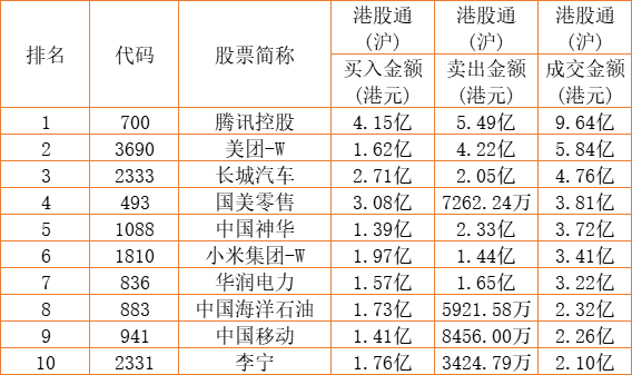 港股通(沪)买卖前十股(单位:港元):