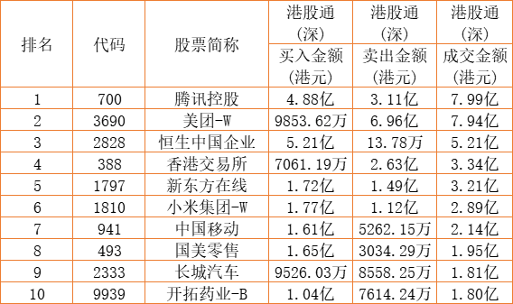 港股通(深)买卖前十股(单位:港元):