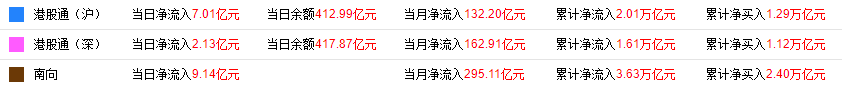 截至8月24日港股收盘,南向资金全日合计净流入9.14亿港元。其中,沪市港股通净流入7.01亿港元,深市港股通净流入2.13亿港元。