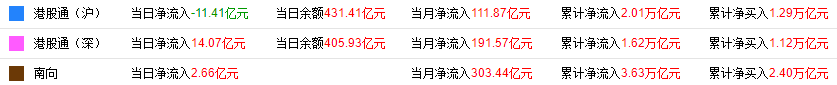 截至8月26日港股收盘,南向资金全日合计净流入2.66亿港元。其中,沪市港股通净流出11.41亿港元,深市港股通净流入14.07亿港元。