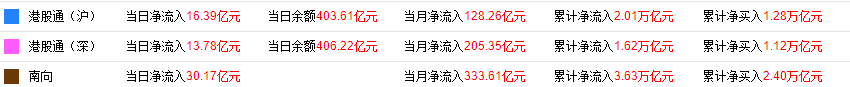 截至8月29日港股收盘,南向资金全日合计净流入30.17亿港元。其中,沪市港股通净流入16.39亿港元,深市港股通净流入13。78亿港元。