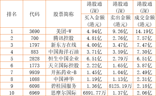 港股通(深)买卖前十股(单位:港元):