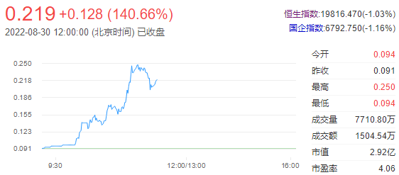 今日走势分析:中国管业(00380)绩后显著拉升,早盘升约85%。22H1,公司实现权益持有人应占溢利3206.3万港元,同比增加42.0%。截至发稿,中国管业涨84.62%,报0.168港元,市值为2.24亿港元。