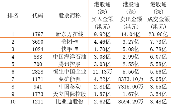 亚汇网实时数据统计:截至8月30日收盘,腾讯控股、美团-W、中国海洋石油居港股通(沪)成交前三,新东方在线、美团-W、快手-W位居股通(深)成交前三。