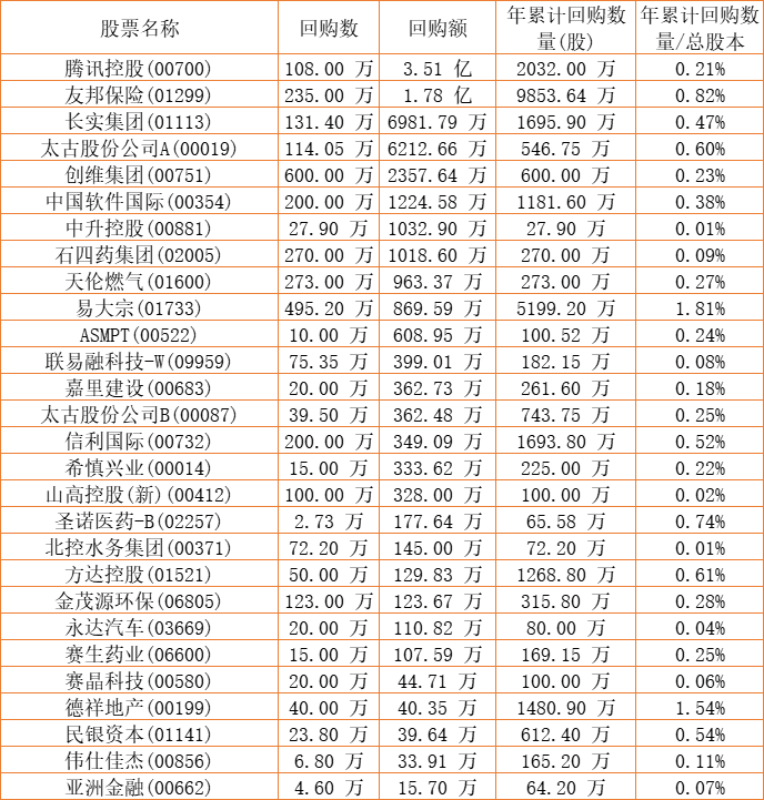 创维集团(00751)、摩比发展(00947)、伟仕佳杰(00856)、信利国际(00732)、亚洲金融(00662)、彩星集团(00635)、腾讯控股(00700)、金茂源环保(06805)、DYNAM JAPAN(06889)、希慎兴业(00014)、德祥地产(00199)、天福(06868)、石四药集团(02005)、联易融科技-W(09959)、中国软件国际(00354)、嘉里建设(00683)、友邦保险(01299)、天伦燃气(01600)、赛生药业(06600)、民银资本(01141)、长实集团(01113)、乐声电子(00213)、赛晶科技(00580)、太古股份公司A(00019)、易大宗(01733)、太古股份公司B(00087)、和谐汽车(03836)、方达控股(01521)、康圣环球(09960)、北控水务集团(00371)、永达汽车(03669)、中升控股(00881)、圣诺医药-B(02257)、山高控股(新)(00412)于2022年8月31日进行了回购。其中,回购金额最大的为腾讯控股(00700),回购数量108.00 万,回购金额3.51 亿元。