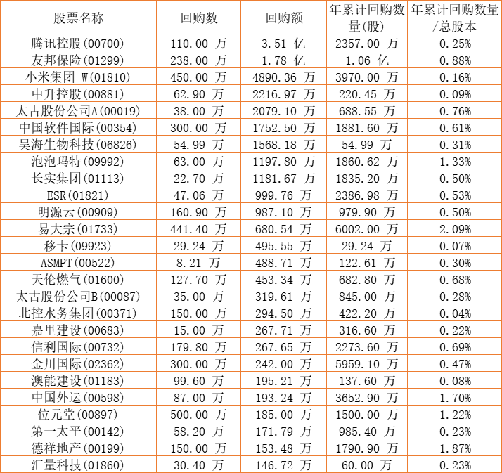 IMAX CHINA(01970)、ASMPT(00522)、中国软件国际(00354)、腾讯控股(00700)、保发集团(03326)、伟仕佳杰(00856)、艾德韦宣集团(09919)、德祥地产(00199)、顺诚(00531)、清科创业(01945)、中国外运(00598)、金川国际(02362)、嘉里建设(00683)、天伦燃气(01600)、太古股份公司A(00019)、民银资本(01141)、赛晶科技(00580)、信利国际(00732)、太古股份公司B(00087)、泡泡玛特(09992)、英皇娱乐酒店(00296)、祖龙娱乐(09990)、友邦保险(01299)、长实集团(01113)、昊海生物科技(06826)、中国科培(01890)、北控水务集团(00371)、方达控股(01521)、山高控股(00412)、移卡(09923)、绿城服务(02869)、天福(06868)、ESR(01821)、和谐汽车(03836)、明源云(00909)、易大宗(01733)、小米集团-W(01810)、乐声电子(00213)、圣诺医药-B(02257)、东软教育(09616)、中升控股(00881)、汇量科技(01860)、港龙中国地产(06968)、第一太平(00142)、康圣环球(09960)于2022年9月5日进行了回购。其中,回购金额最大的为腾讯控股(00700),回购数量110.00 万,回购金额3.51 亿元。
