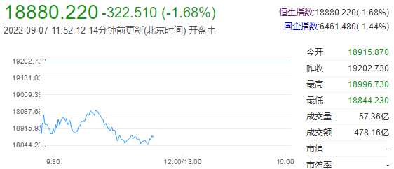 截至午间收盘,恒生指数跌1.68%,报18880.22点,国企指数跌1.44%,红筹指数跌0.86%。恒生科技指数跌2.3%,明源云跌12.52%,哔哩哔哩跌5.6%,快手跌4.74%。