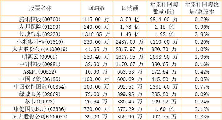 摩比发展(00947)、兴胜创建(00896)、第一太平(00142)、建业新生活(09983)、天伦燃气(01600)、腾讯控股(00700)、天福(06868)、中国软件国际(00354)、DYNAM JAPAN(06889)、北控水务集团(00371)、瑞安房地产(00272)、绿城服务(02869)、康健国际医疗(03886)、友邦保险(01299)、方达控股(01521)、长城汽车(02333)、太古股份公司A(00019)、信利国际(00732)、联易融科技-W(09959)、IMAX CHINA(01970)、民银资本(01141)、太古股份公司B(00087)、祖龙娱乐(09990)、澳能建设(01183)、清科创业(01945)、硬蛋创新(00400)、移卡(09923)、港龙中国地产(06968)、小米集团-W(01810)、复星国际(00656)、明源云(00909)、赛晶科技(00580)、汇量科技(01860)、中国外运(00598)、中国飞鹤(06186)、圣诺医药-B(02257)、创梦天地(01119)、康圣环球(09960)、中升控股(00881)、维信金科(02003)于2022年9月9日进行了回购。其中,回购金额最大的为腾讯控股(00700),回购数量115.00 万,回购金额3.53 亿元。