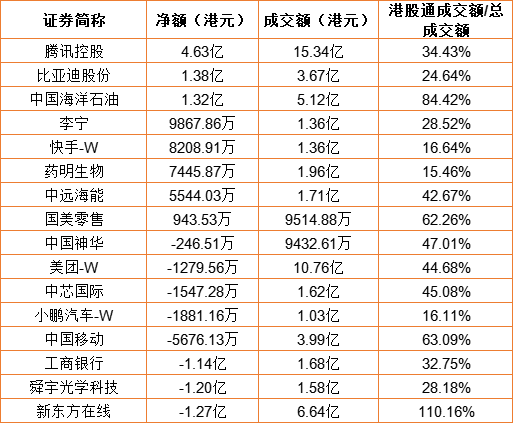 亚汇网9月20日港股通数据统计显示:腾讯控股净买入额居首,达4.63亿港元,新东方在线净卖出额居第一位。(亚汇网编辑:陌尘)