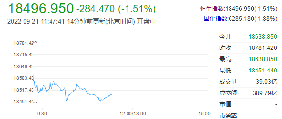 港股上午盘三大指数低开低走,恒指跌1.51%下挫近300点,国指跌1.88%,恒生科技指数跌2.48%,三者再度刷新调整低价。