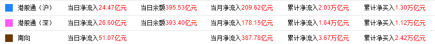 9月21日,南下资金净流入51.07亿港元,其中港股通(沪)净流入24.47亿港元,港股通(深)净流入26.6亿港元。