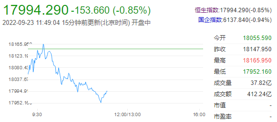 9月23日,港股半天下来,指数冲高后快速跳水,恒生指数跌0.85%,报收17994.29点;恒生科技指数跌2.05%,报收3598.34点。