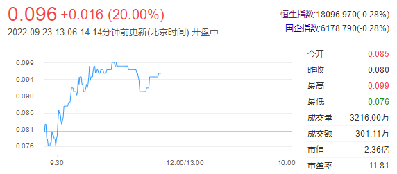 今日走势分析:中国投资开发(00204)继续走高,早盘拉升21%。8月11日至今,中国投资开发已累计发布6份战略合作意向书公告。期间股价累涨近1.1倍。截至发稿,中国投资开发涨21.25%,报0.097港元,市值2.39亿港元。