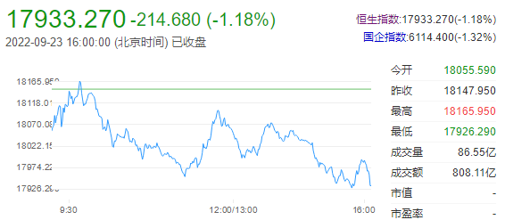 9月23日港股再度走弱,恒生指数收跌1.18%,创2011年11月以来收盘新低,本周累跌4.42%;恒生科技指数跌2.29%,续创3月16日以来收盘新低,本周累跌6.97%。港股后市展望:兴业证券张忆东表示,从行情来看,港股已经确认了市场的底部,因为地缘政治、紧缩、疫情,这种黑天鹅同时出现所导致的港股3月份是一种危机模式,包括三季度末最近也有一点小危机的模式。基本上今年确认了港股中长期的底部区域,现在已经是最糟的时候,但是大机会还要等待美联储的转向。要立足于中长期的基本面找alpha,继续在短期忍受着煎熬。一方面在成长股方向,以“新半军”为代表的先进制造业,特别是明年的信息科技来找alpha。从价值股的角度来说,一是央企、国企的能源;二是央企、国企的地产;三是如果经济能够企稳,部分消费方面的有科技含量的互联网,以及有品牌溢价的,如果说疫情防控更加强调精准防控,社会服务也会有机会。