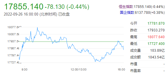 9月26日,港股收盘,指数全天宽幅震荡,截至收盘,恒生指数跌0.44%,报收17855.14点;恒生科技指数涨1.61%,报收3647.39点。港股后市展望:中金公司认为,假期前港股市场交投或将持续清淡,投资者可能降低风险敞口等待更为清晰的政策信号,因此短期内市场可能处于持续盘整中。不过,由于市场已经跌至数年低点,国内或外部环境一旦出现明显改善,无论是经济进一步修复还是中美审计合作取得进展,都有望推动市场出现反弹。在此之前,以港元计价的高股息收益率个股对投资者而言可能是较好的选择,可以提供下行保护和对冲人民币贬值的负面影响。