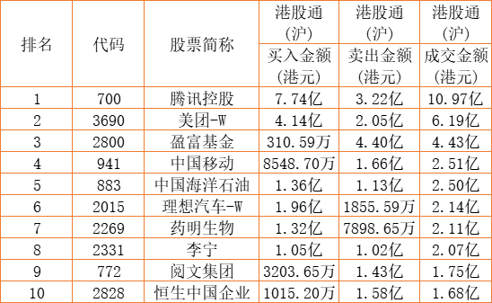 港股通(沪)买卖前十股(单位:港元):