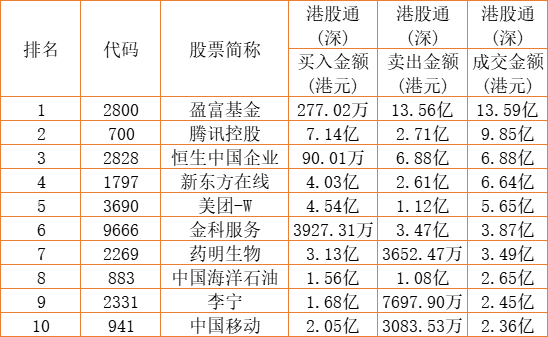 港股通(深)买卖前十股(单位:港元):