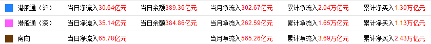 9月28日,南下资金净流入65.77亿港元,其中港股通(沪)净流入30.64亿港元,港股通(深)净流入35.13亿港元。