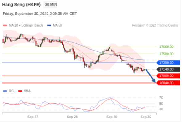 交易策略: 在 17300.00 之下,看跌,目标价位为 17000.00 ,然后为 16840.00 。