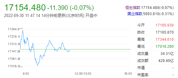 9月30日午间,港股两大指数高开低走,开盘下探后跌幅缩窄,香港恒生指数跌0.07%,恒生科技指数跌1.23%,盘中一度跌超2%。