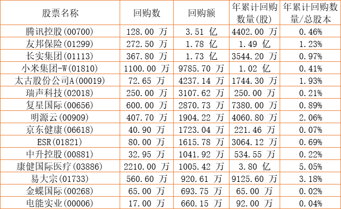 中国星集团(00326)、彩星集团(00635)、金利来集团(00533)、维信金科(02003)、绿城服务(02869)、第一太平(00142)、首佳科技(00103)、摩比发展(00947)、澳能建设(01183)、新鸿基公司(00086)、天福(06868)、德祥地产(00199)、瑞安房地产(00272)、澳优(01717)、北控水务集团(00371)、希慎兴业(00014)、DYNAM JAPAN(06889)、中国软件国际(00354)、亿都(国际控股)(00259)、天伦燃气(01600)、明源云(00909)、腾讯控股(00700)、康健国际医疗(03886)、兴胜创建(00896)、瑞声科技(02018)、电能实业(00006)、联易融科技-W(09959)、易大宗(01733)、金蝶国际(00268)、清科创业(01945)、赛晶科技(00580)、港龙中国地产(06968)、祖龙娱乐(09990)、小米集团-W(01810)、京东健康(06618)、创胜集团-B(06628)、信利国际(00732)、康哲药业(00867)、中国科培(01890)、福寿园(01448)、方达控股(01521)、太古股份公司A(00019)、太古股份公司B(00087)、酷派集团(02369)、长实集团(01113)、中远海运国际(00517)、友邦保险(01299)、移卡(09923)、康圣环球(09960)、金山软件(03888)、复星国际(00656)、乐声电子(00213)、和谐汽车(03836)、圣诺医药-B(02257)、亚洲联网科技(00679)、阅文集团(00772)、中升控股(00881)、ESR(01821)、知乎-W(02390)于2022年9月29日进行了回购。其中,回购金额最大的为腾讯控股(00700),回购数量128.00 万,回购金额3.51 亿元。