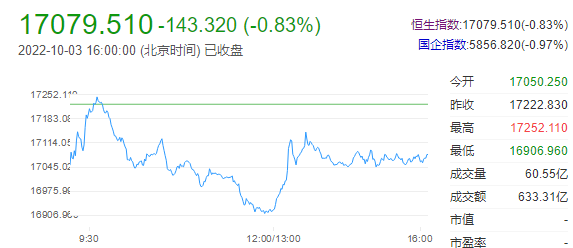 10日3日下午,港股收盘,行情全天低开低走,午后加速下探后小幅回升,香港恒生指数收跌0.83%险守17000点大关,恒生科技指数收跌0.67%。市场呈跌多涨少态势。港股后市展望:中金公司表示,往前看,随着中国内地投资者本周迎来国庆长假,我们预计市场交投或将相对清淡,投资者可能等待二十大会议的召开,并从中寻求更为清晰的政策信号,因此未来几周市场可能处于持续盘整中。在目前水平市场的上涨空间大于下跌风险。在此之前,以港元计价的高股息收益率个股对投资者而言可能是较好的选择,可以提供下行保护和对冲人民币贬值的负面影响。另外,优质成长个股(例如增长维持高景气或者存在盈利反转可能的板块或标的)可能仍然是较好的选择。中期来看,判断市场出现反转或将取决于以下两个因素的兑现:1)美联储放缓加息步伐;2)有更明确证据显示中国经济增长正在摆脱低谷。