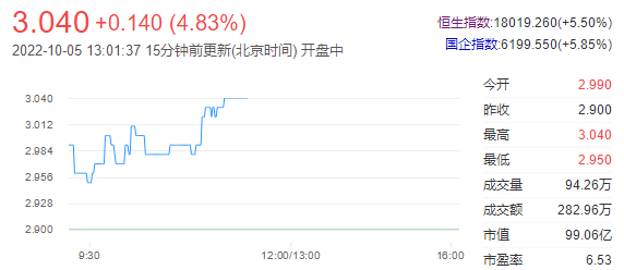 今日走势分析:港华智慧能源(01083)早盘涨近5%,截至发稿,涨4.83%,报3.04港元,成交额273.24万港元。